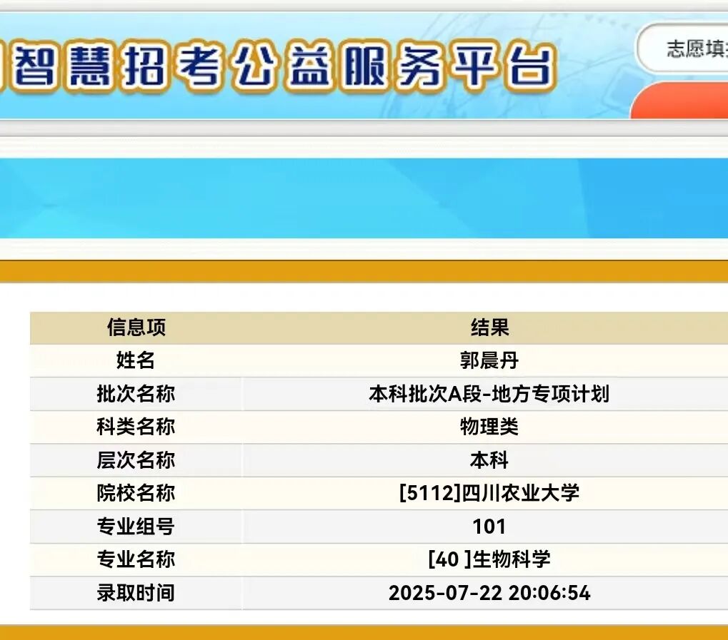 郭晨丹,四川农业大学(地方专项计划)生物科学专业