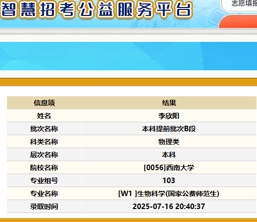 李欣阳,西南大学(本科提前批B段)生物科学专业
