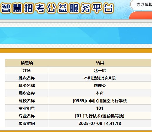 赵一杭,中国民用航空飞行学院(本科提前批A段)飞行技术专业