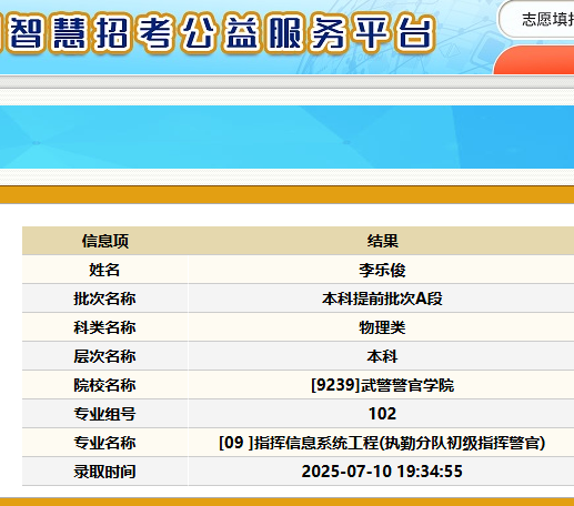 李乐俊,武警警官学院(本科提前批A段)指挥信息系统工程专业