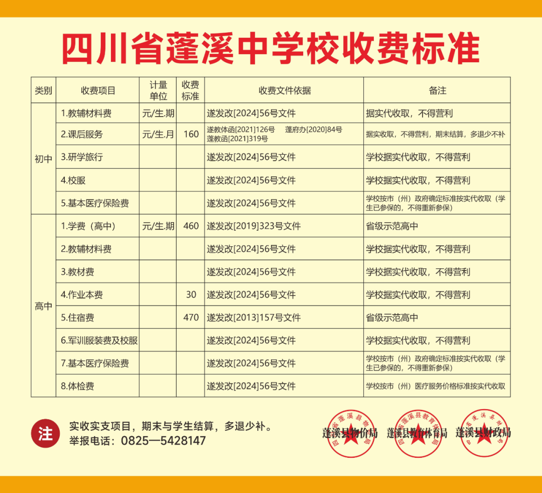 我县义务教育阶段学生实行“三免一补”政策,即:免学杂费、免教科书费、免作业本费,对家庭经济困难学生补助生活费。家庭经济困难的学生需主动向学校报告,并按要求提供相关资料,学校会按要求进行办理。教辅资料需家长自主认购,家长可通过新华文轩蓬溪分公司的线上认购及缴费渠道自主认购。线上认购及缴费有困难的家长,可寻求学校帮助。严格落实食堂管理制度,我校配备完善消毒柜、冷藏柜、留样柜、紫外线灯等确保食品安全的设施设备,实现学校食堂统一用餐餐具、统一消毒。我们郑重承诺,我们将加强监督管理,提升学生用餐质量,确保学生吃得营养、健康。感谢你们对教育的支持与理解,欢迎对学校办学行为进行监督、对违规办学行为进行举报。让我们共同努力打造一个良好的教育生态环境。