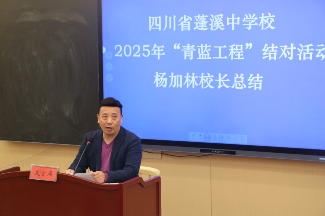 活动最后,杨加林校长作总结讲话,向指导教师和新教师提出了明确要求。青蓝工程是蓬溪中学教师队伍建设的重要抓手,骨干教师要做好 “引路人”,不仅要在业务上悉心指导,更要传承学校的优良教风与育人初心;青年教师要珍惜机会,保持谦逊好学的态度,既要学习师傅的教学技巧,更要领悟师傅的育人情怀,在实践中锤炼本领、快速成长。他强调,学校将全力支持青蓝工程的开展,为师徒结对搭建良好的交流平台,希望全体师徒能够同心协力、携手共进,以青蓝携手之姿,共同书写蓬溪中学教育教学质量提升的新篇章,为培养更多优秀人才贡献力量。