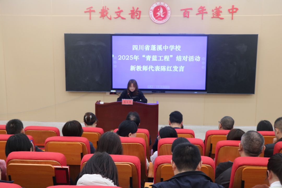 新教师代表陈红老师发言。她提到,青年教师满怀对教育事业的热忱,也深知自身在经验积累、专业能力上的不足。在未来的工作中,将以师傅为榜样,虚心请教、勤学善思,在实践中积累经验,在反思中提升能力,努力快速成长为一名合格乃至优秀的蓬溪中学教师,不辜负学校与师傅的期望。