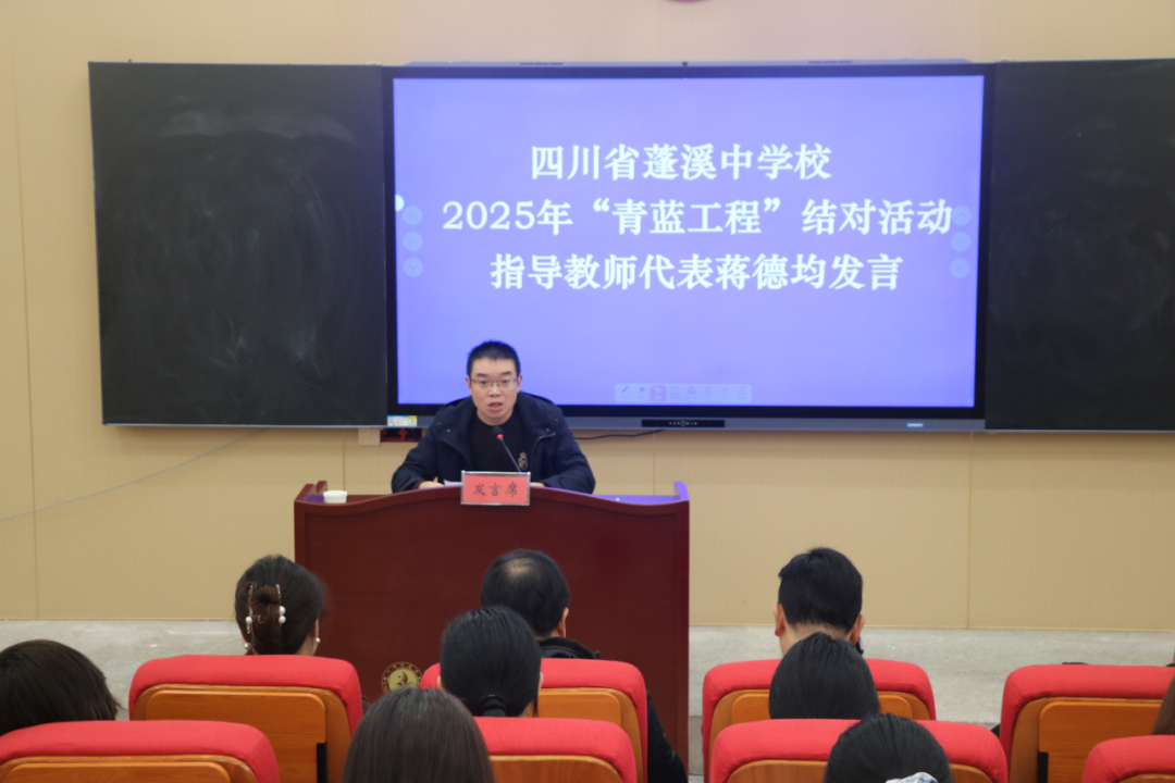 指导教师代表蒋德均老师分享了自己多年的教育教学感悟,坦言指导青年教师的过程既是 “传帮带”,也是教学相长的过程。他承诺,将毫无保留地分享教学经验、班级管理技巧与教研方法,在备课、授课、评课等各个环节为青年教师答疑解惑,同时也会虚心向青年教师学习新颖的教学理念与现代教育技术,与青年教师共同进步、共同成长,携手为蓬溪中学的教育事业添砖加瓦。